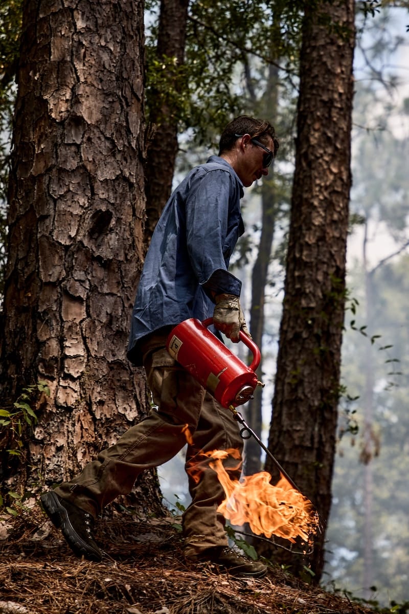 “Good job, nice,” George Jensen says to his partner, pointing at the neat rows of loblolly pines to his left. The forest floor between the trees is smooth and black, except where a bare twig pokes from the ash. “There’s not an ounce of scorch on those trees,” he says. “That’s a really, really good burn right there.”