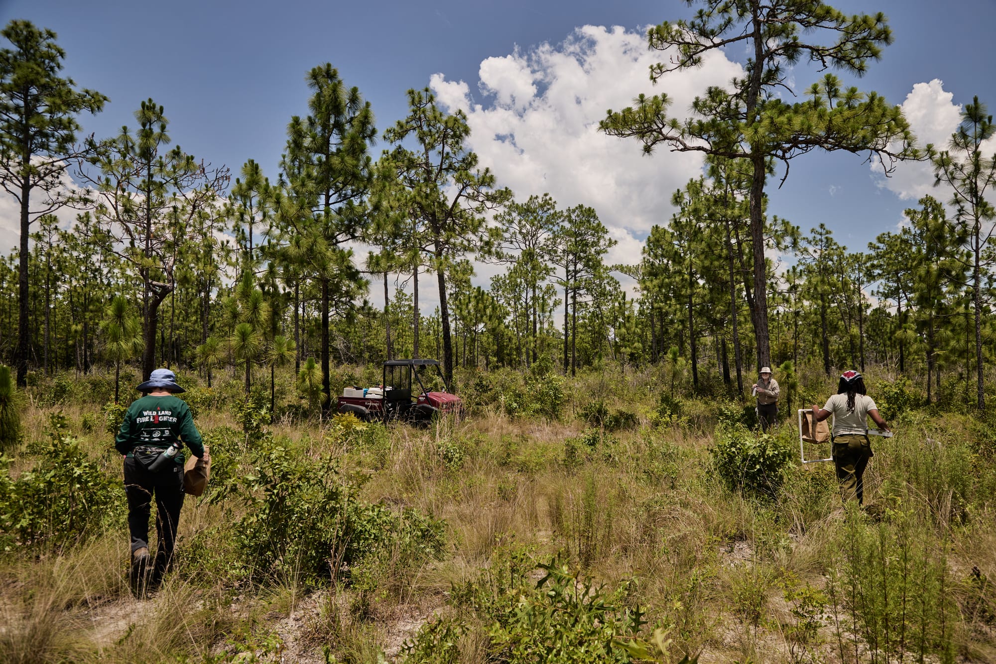 Once upon a time, a cigar company cleared the pines from this stand to grow tobacco. In the ’60s, the fields were abandoned and became a pine plantation supplying a local plywood factory. The forest shows its wear: half-buried piles of logging slash, neat rows of pine, non-native grasses. Laurels and oaks have grown overhead in the years since it last burned. Today’s goal is to kill them off with what Dr. Bud calls a “clean fire,” one that leaves the pines above completely untouched. “We get a lot of microclimates in the trees”—spots where a fire could die off or smoulder for days. He points to the west: “This side’s bad. The hunters complain bitterly.”
