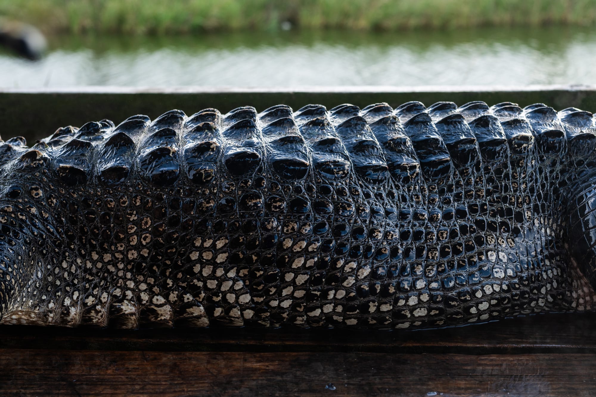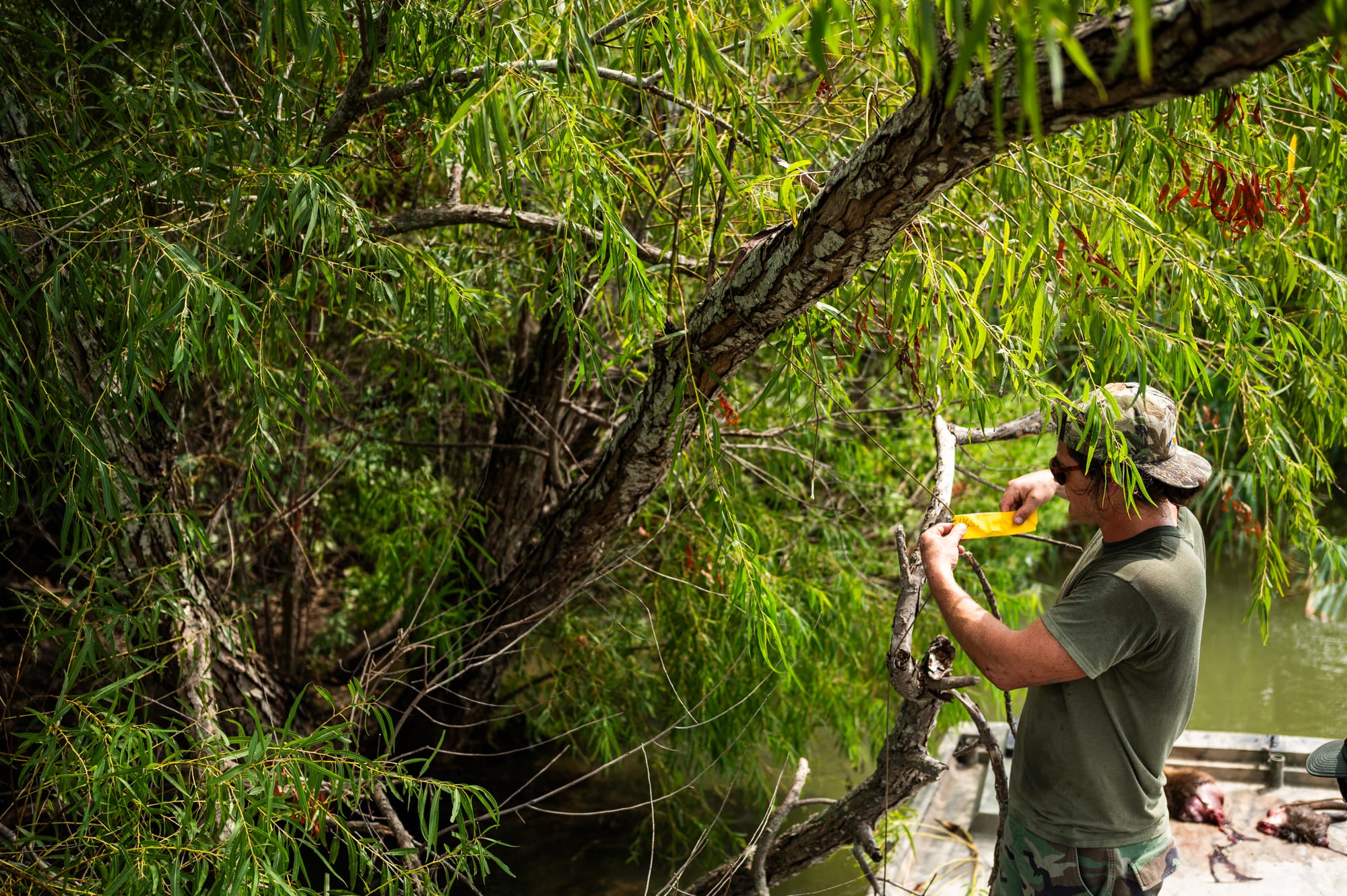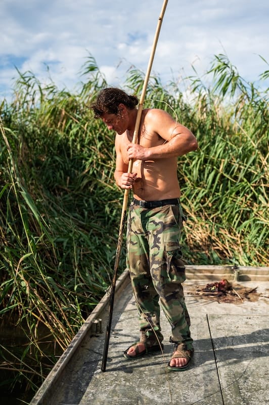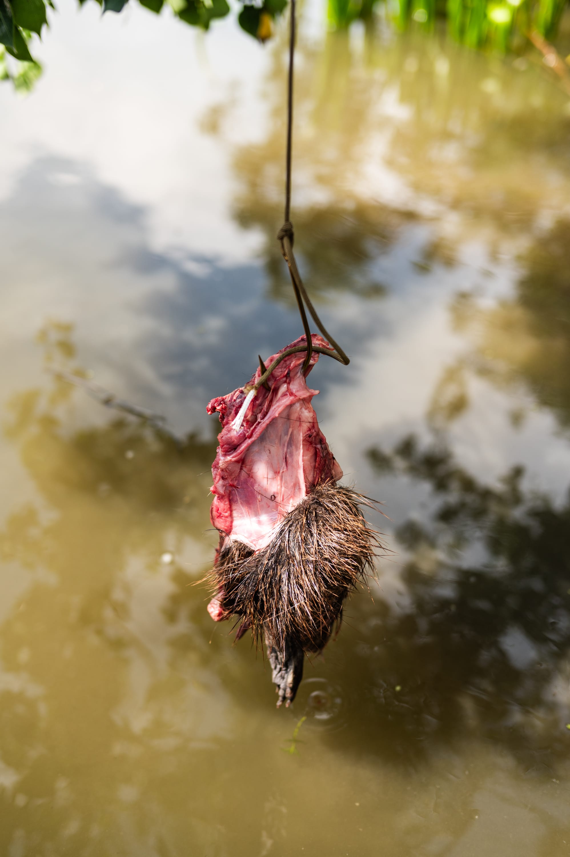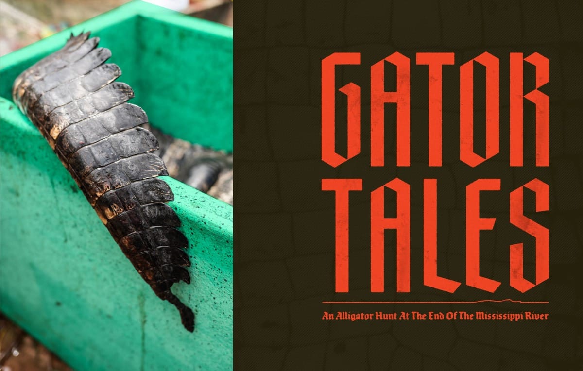 We drove down to Venice, Louisiana, on a Sunday morning and waited for the weather to clear up before hitting the water. On these lottery hunts, you’re required to use a hook and line to bait the gator—as opposed to dragging a large treble hook through the water or shooting them out in the open—so we scouted canals for places to set our bait. At each spot, we planted a sixteen-foot bamboo pole, then tied a heavy line to the base and used a clothespin to suspend the line and hook about six inches above the water. Traditionally, hunters use rotting chicken as bait, but this team was far from traditional: we used a mix of fresh pigeon, roadkill nutria, and a mullet that jumped into the boat while we were scouting. With our lines set, we headed out into the Gulf and fished until sundown.