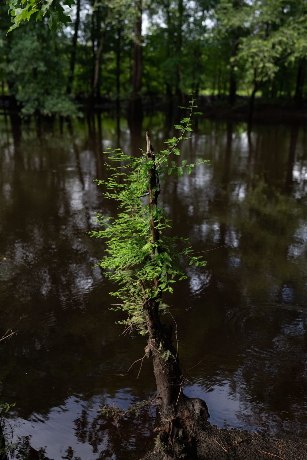 The tannins from the ancient bald cypress trees have stained the water a rich, dark brown, like a mug of oversteeped tea. The river is shallow enough that I can see schools of tiny fish swishing below the surface, their slender, uniform bodies gliding between and around small plants. A large jagged rock juts out of the water and offers a resting spot for a small box turtle. His long neck stretches high, as if in worship of the sunlight.