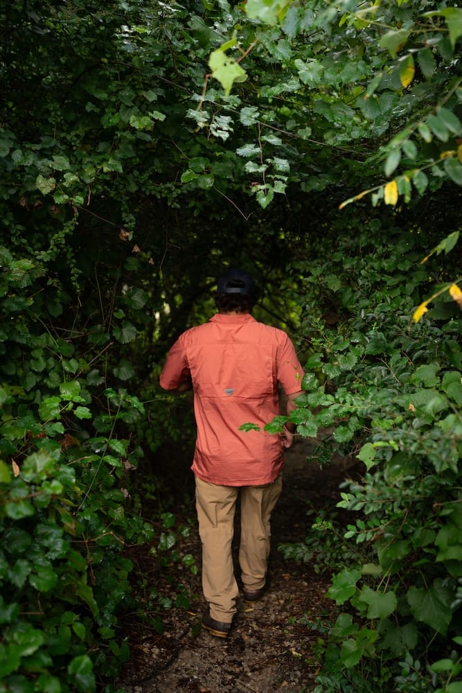 We paddle into a slough where the water opens into a wide copse of trees, forming a semicircle. The water is still here. It’s quiet, save for the occasional birds. Kullen returns to my question, explaining that the classification of a river or a creek is dependent upon depth and length, but it’s mostly subjective. At its deepest, the river reaches down about six feet, but everywhere else, you can stand up.