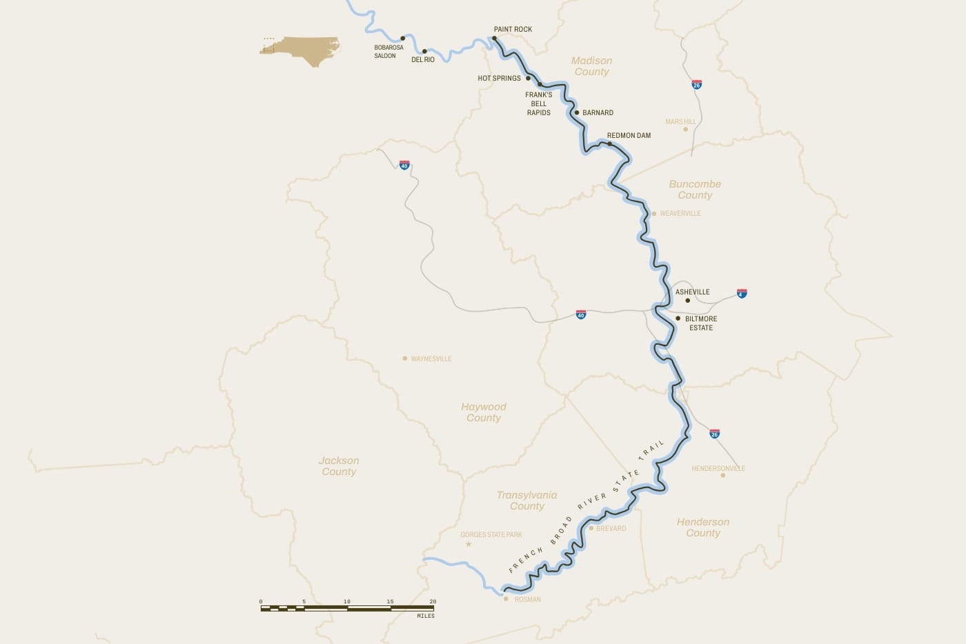 Near the headwaters, there’s Brevard, a hub of mountain biking and rock climbing. Toward the middle, there’s Asheville, the region’s epicenter of culture. Further downstream are the small towns of Marshall and Hot Springs, two up-and-coming hamlets that have all the trappings of hip mountain towns—breweries and artisanal pizza—but still retain a rural, blue-collar vibe.